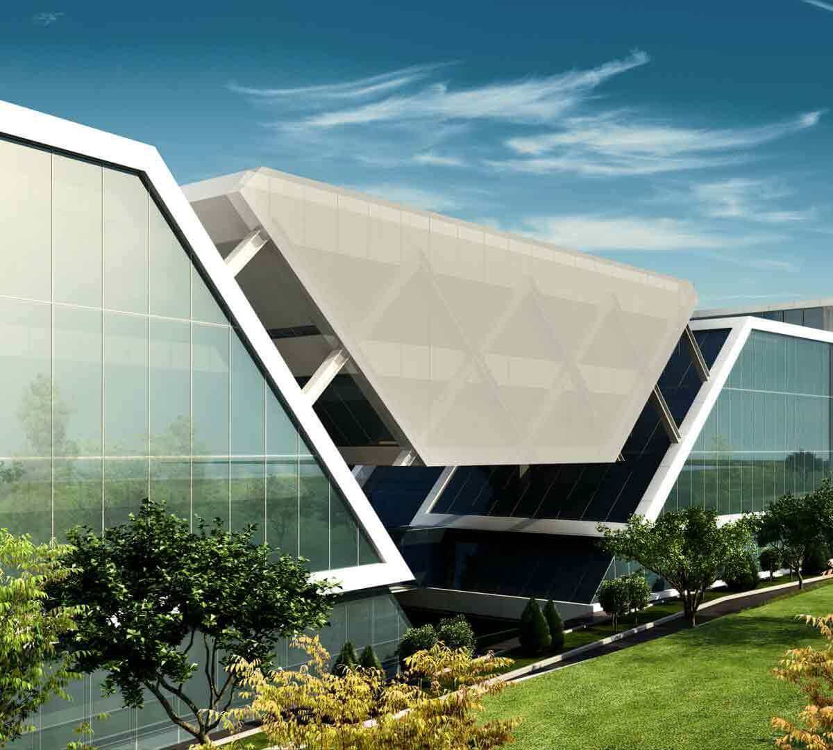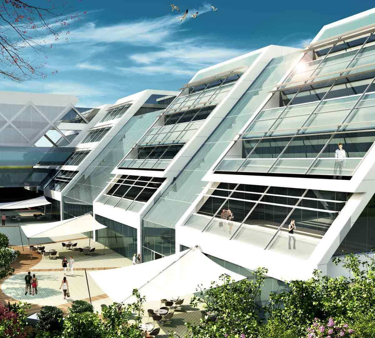 Bina arsa geometrisi, parsel yapısı ve çevre dokusu göz önünde tutularak üç ana kitleden oluşmuştur. Kitle biçimlenişinde ana yaklaşım yönleri, yeşil-dış mekana açılma, iç sokaklar ve mekanların doğal ışıktan maksimum yararlanması belirleyici olmuştur. Tüm merkezde yatay ulaşımda ve mekânsal algıda süreklilik sağlanmıştır. Cepheler, doğal ışığı olabildiğince içeriye alacak bir geçirgenliğe sahiptir. Mimari biçimlenmeye uygun olarak, enerjinin verimli kullanımını ön gören, enerji tasarrufu sağlayan çift cidarlı bir cephe önerilmiştir.