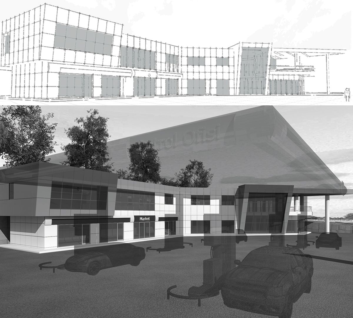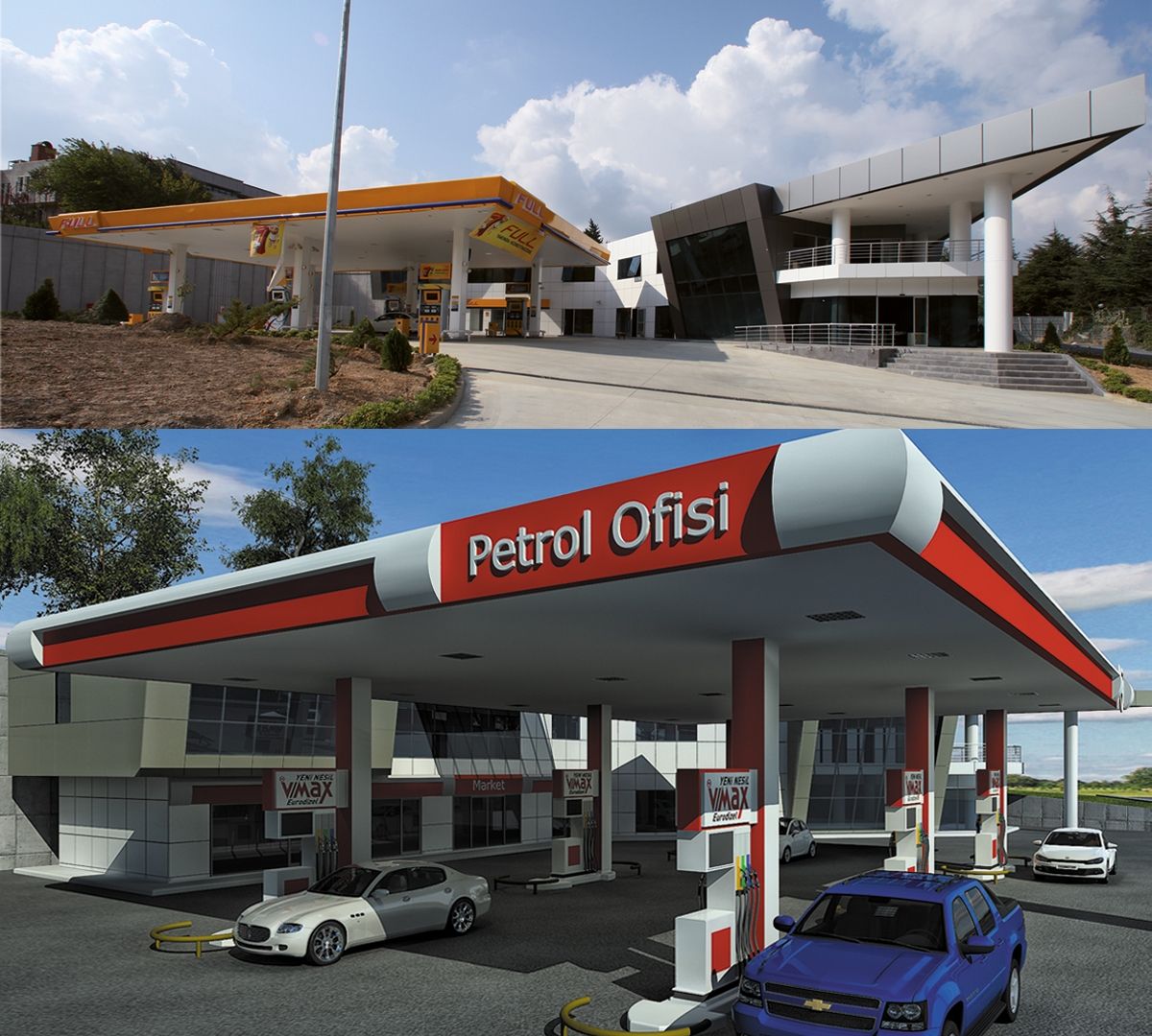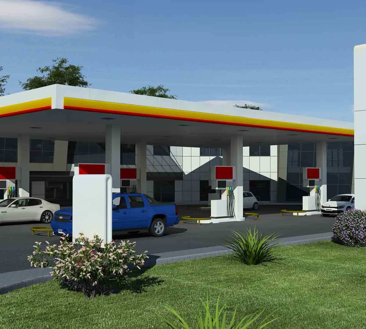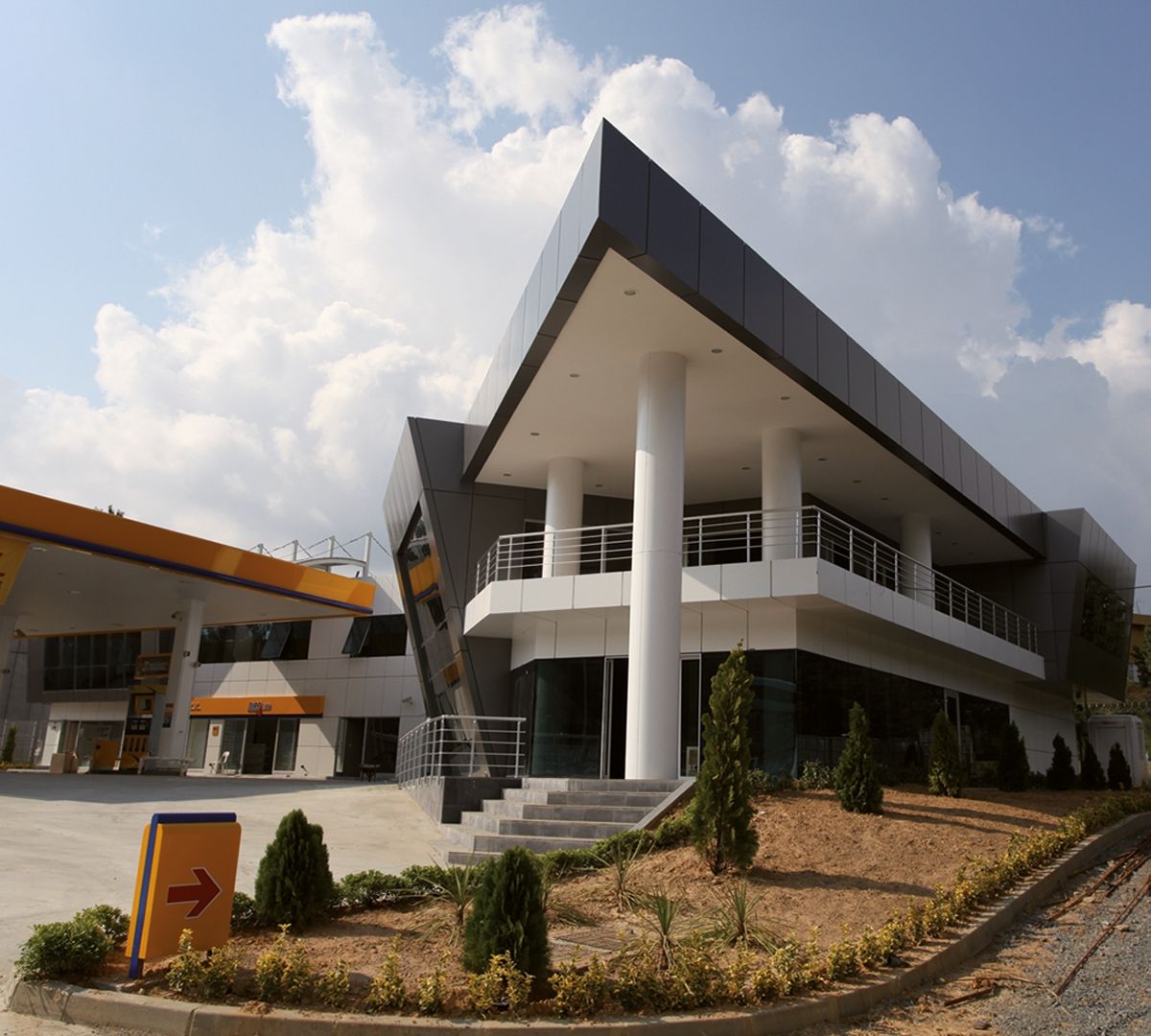 Akaryakıt istasyonuna ilave olarak satış birimleri ve showroomun da yer aldığı yapı, köşe çözümü ile dikkat çekmektedir.